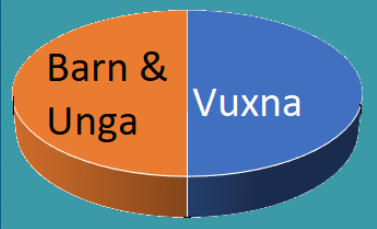 Cirkeln visar om det är en vuxen eller inte som gör sexuella övergrepp mot barn. Hälften av övergreppen sker av vuxna över 20 års ålder - Blå fältet. Och hälften av dom som själva är barn och ungdomar-orange. Så en pedofil, eller annan person som begår sexuella övergrepp på barn, kan nästan ha vilken ålder som helst. Det här är viktigt!!! För det är inte bara "fula gubbar" som är farliga. Det kan lika gärna vara en 55-åring som en 16-åring.